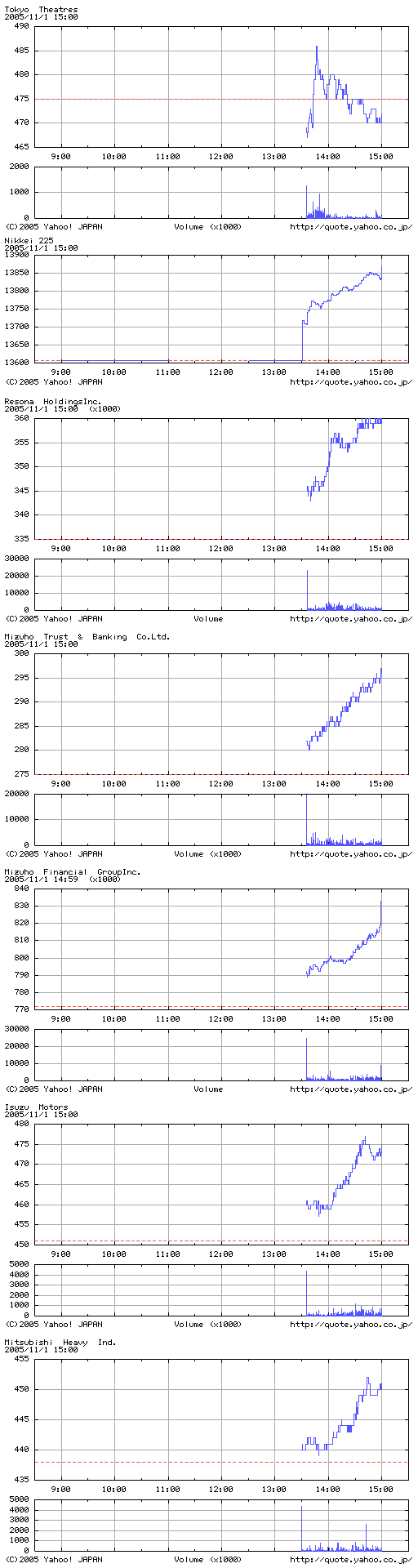 と、これを見て地方銀行である千葉・横浜・静岡はどうでもいい。 結果を見れば採用銘柄であれば横浜銀行を除きすべてプラス引け。 で、上に書いたように千葉・横浜・静岡を除いた結果をさらに示せば圧倒的な強さだ。 特に異常なのが、みずほ信託銀行。今日は+43引けと馬鹿みたいな上げ。 銀行銘柄で前日比10%越えってのはほとんど見ないからねぇ。 東証一部値上がり率ランキング第3位、全市場値上がり率ランキング第14位。 東証一部出来高上位ランキング第1位、全市場出来高上位ランキングでも第1位。 東証一部売買代金上位ランキング第4位、全市場売買代金上位ランキングも同じく第4位。 という感じで今日の注目銘柄は圧倒的にみずほ信託だった。 ま、出来高は2日の方が多いんだけどね。 もし10月27日に買ったのがテアトルじゃなくてみずほ信託だった場合、終値換算すると 10月27日みずほ信託は257引け、今日の終値が351なので+94。2単位買う事になってるので 94がx2になって184。1単位株は1,000株なのでx1000すると、18万4000円となる。 そしてテアトルは6万3000円。差は約3倍か。これは凄い。ま、結果論でしかないけどさ。 だからといってテアトルを売却して新規にみずほ信託を買うのにはかなりの勇気がいる。 25日線を大幅に乖離し、いつ急落するかわからないからだ。 日経225は4年半ぶりの高値だし・・・いつ急落になるのやら。